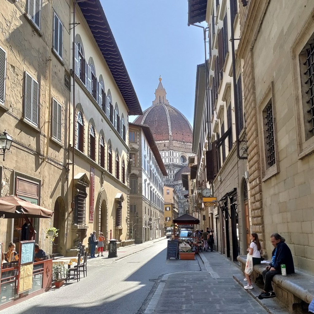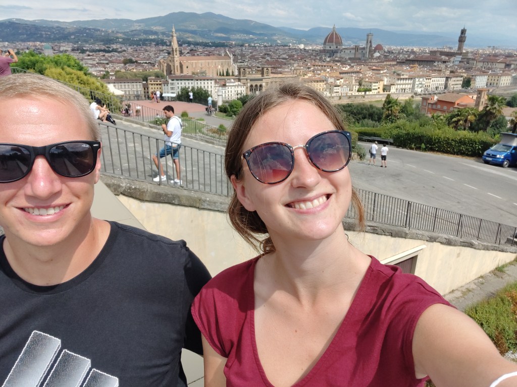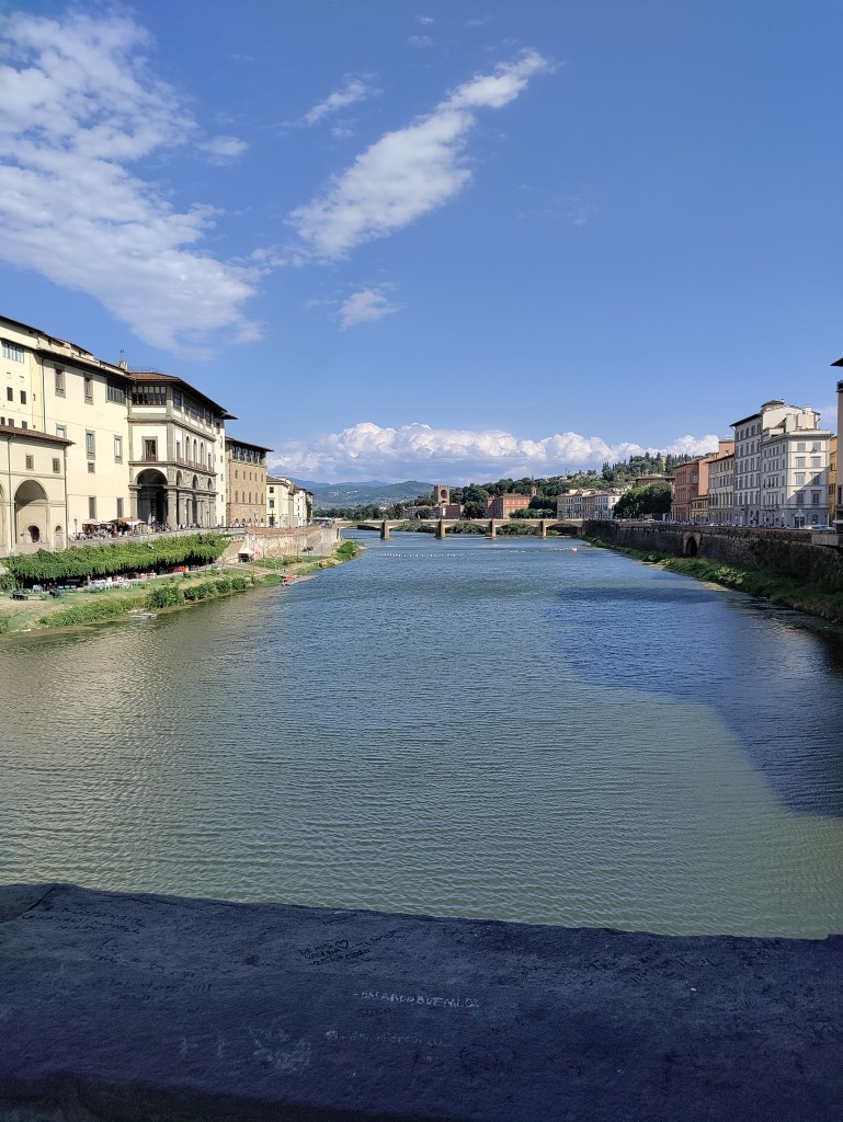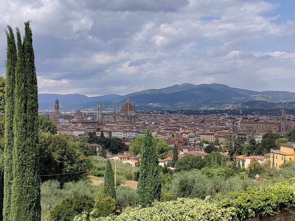 Den vorletzten Tag verbrachten wir in Florenz – meinem absoluten Highlight des Urlaubs! Wir parkten weit außerhalb und wollten über die umliegenden Hügel auf Florenz zu laufen und dann die Stadt erkunden. Diese Idee, die anfangs aufgrund der Strecke etwas abschreckend wirkte, stellte sich als hervorragend heraus, weil mein nach einer halben Stunde einen fantastischen Ausblick auf die gesamte Stadt und die Umgebung hatte! Sogar von hier aus wirkte der Dom inmitten der Stadt gigantisch. Die Zypressen und Olivenbäume in der Landschaft machten die Atmosphäre komplett. Wir bahnten uns also einen Weg zum Fluss Arno, über den auch die weltbekannte Ponte Vecchio führt, die Brücke der Goldschmiede. Um einen Rundgang machen zu können, überquerten wir den Fluss auf einer anderen Brücke und tauchten in die wunderschöne Altstadt Florenz ein. Wir sahen Kirchen und altertümliche Gassen, doch das eigentliche Ziel wartete in der Stadtmitte: die Cattedrale di Santa Maria del Fiore