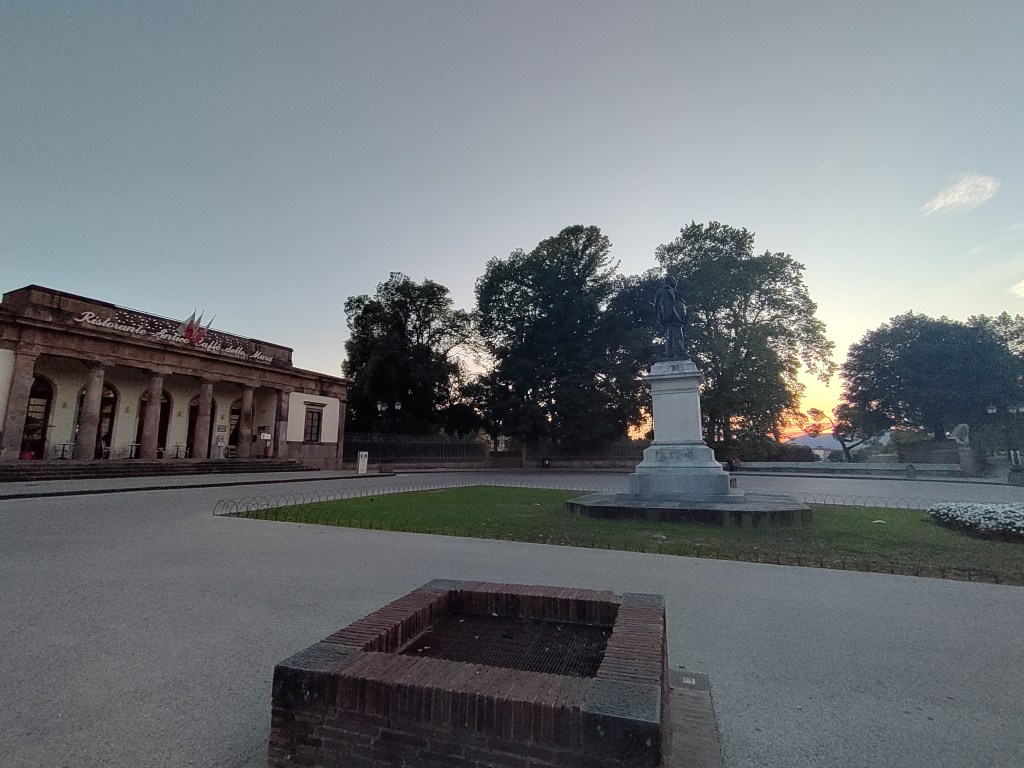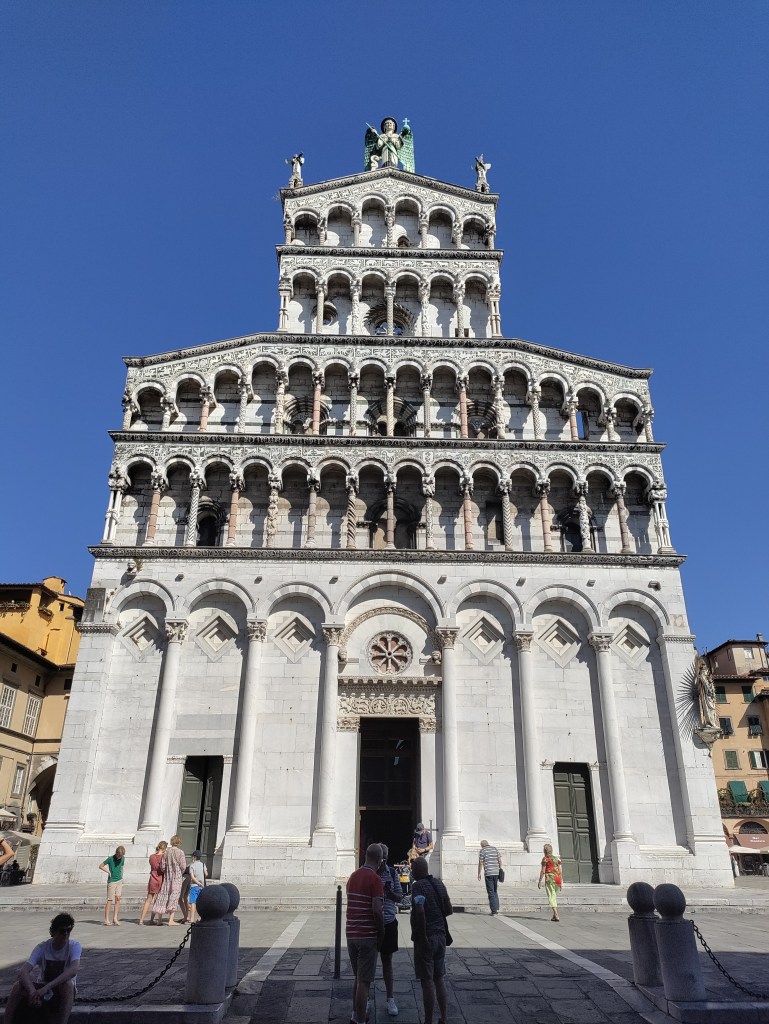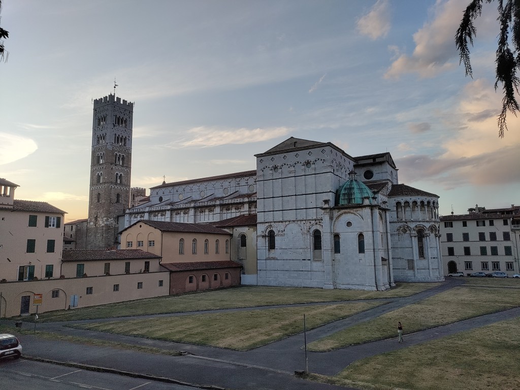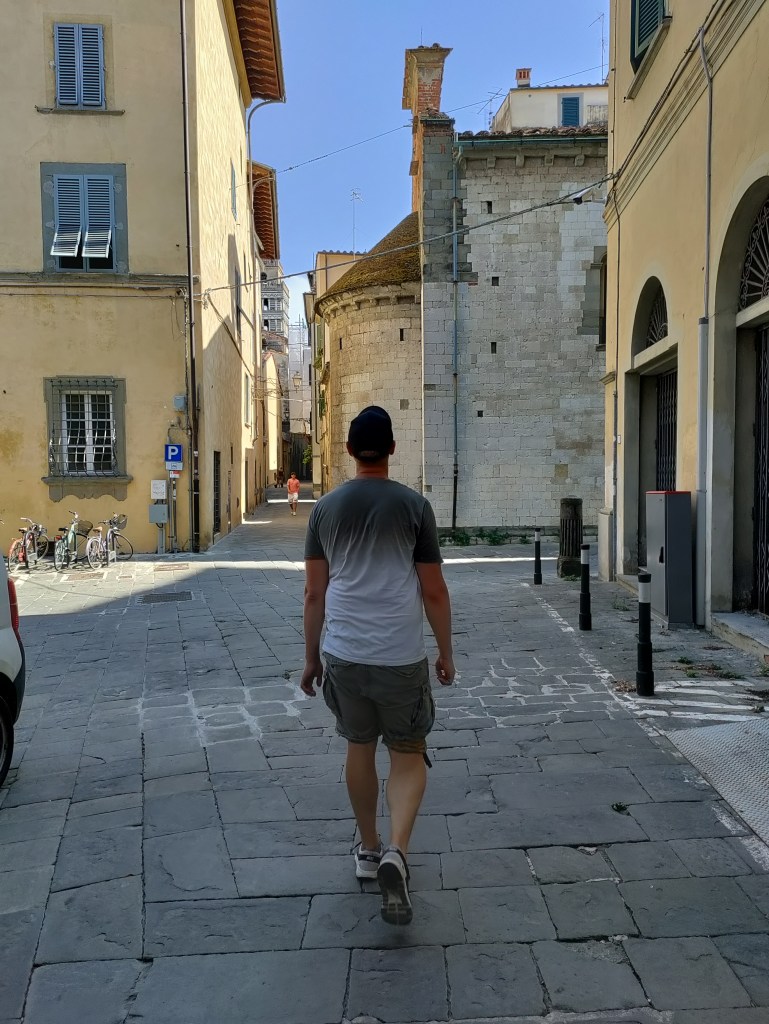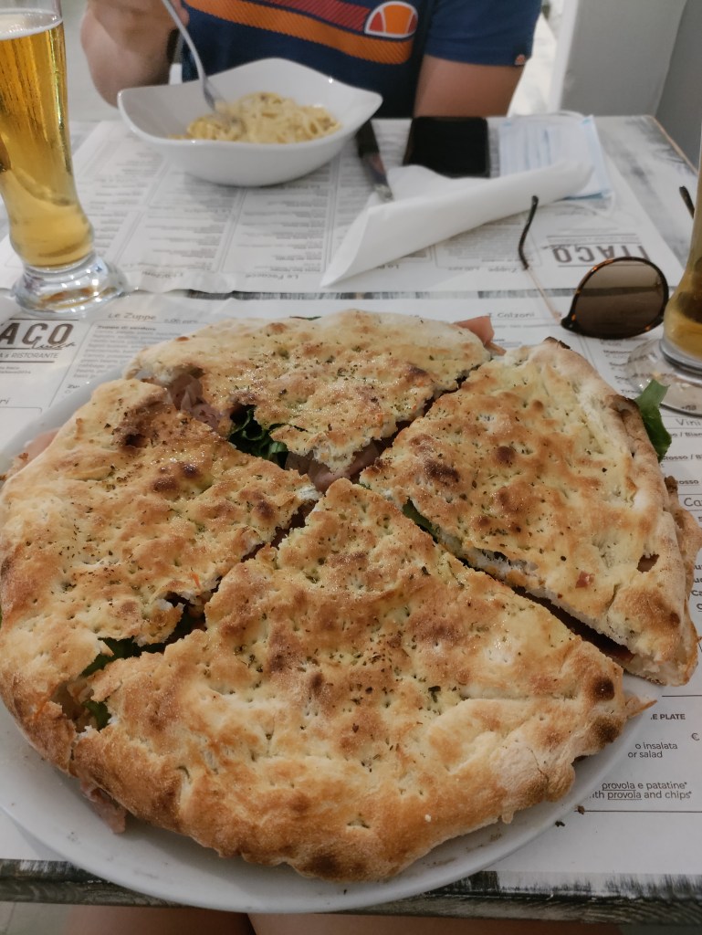 Als wir zum Abendessen in Lucca waren, konnten wir in der Dämmerung nicht besonders viel sehen und erkunden. Da der erste Eindruck aber echt gut war, wollten wir unbedingt einmal durch die Gassen spazieren und uns die Stadt von Nahem anschauen. Das Interessanteste war eigentlich der massive Mauerwall um die Stadt herum, auf dem mit Blick auf die Stadt man spazieren gehen konnte. Die Stadt wirkte groß und wohlhabend auf uns, die Straßen waren sauber und es war nicht übermäßig viel los. Während wir so durch die Gässchen liefen, überkam uns der Hunger und wir setzten uns in ein kleines Café. Ich erinnerte mich an meinen Schüleraustausch in Neapel im Jahr 2015 und wie lecker ich Foccaccia damals fand. Dabei handelt es sich entweder um normalen Pizzateig oder Fladenbrot, der einmal horizontal halbiert wird und anschließend mit allen Zutaten belegt wurde, auf die man Lust hatte. Dann wurde die obere Hälfte wieder draufgelegt und im Ofen noch mal heiß gemacht. Mhm!!! Die Wahl fiel demnach schnell auf das Gericht und es gab nichts zu bereuen 😉