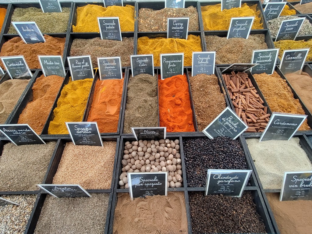 Ein Basar auf dem Marktplatz in Lucca, hier ein Gewürzstand mit allerlei verschiedenen Gewürzen