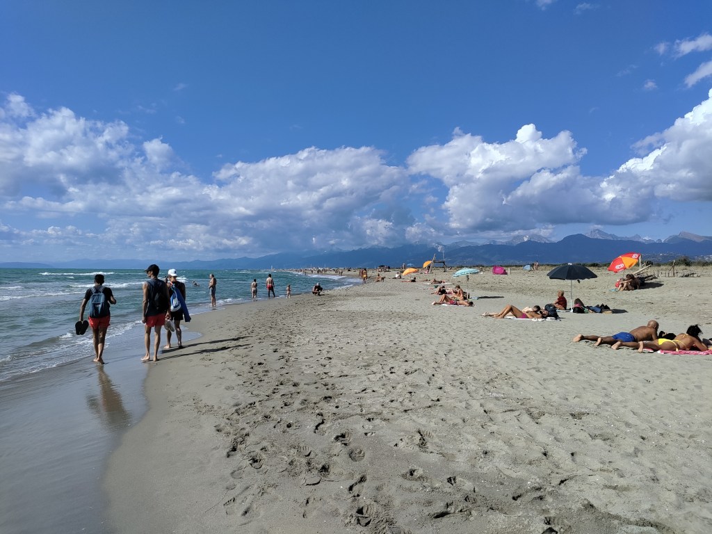 Zuletzt fuhren wir zu einem kostenlosen Strand, den ich auf google maps südlich von Viareggio, dem Küstenstädtchen, gefunden hatte und wir fuhren ohne große Erwartungen dorthin. Wir waren positiv überrascht, weil die Müll-Situation nicht ansatzweise so schlimm war, wie wir sie erwartet hatten. Außerdem waren kaum Menschen da, wodurch man auch genügend Platz zum Hinlegen und Sonnen hatte und sich nicht bedrängt fühlte.