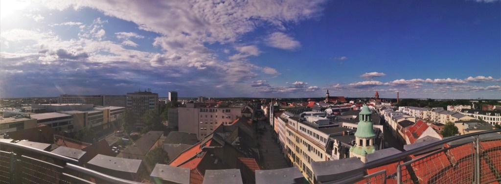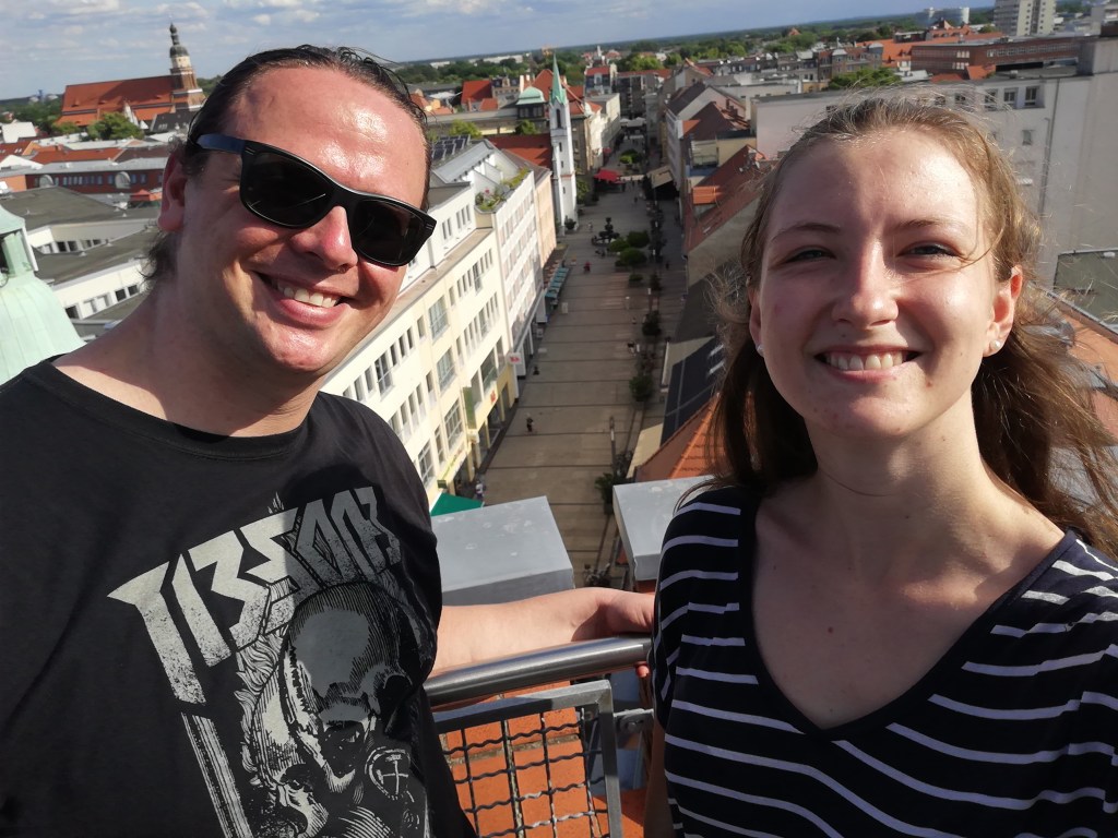Nach einer ausgiebigen Badezeit machten wir uns auf den Rückweg und ich brachte den Wagen zurück zur Unterkunft. Von dort aus liefen wir ins Stadtzentrum in Richtung Spremberger Turm. Hier konnte man für 2 € die 131 Stufen bis zur Spitze erklimmen und hatte von dort aus eine hervorragende Aussicht über Cottbus – und zwar in alle Richtungen! Um den Tag ausklingen zu lassen, setzten wir uns in ein Diner am Altstadtmarkt, an dem es vor Cafès und Restaurants nur so wimmelt. Vor allem im Sommer herrscht hier eine tolle Atmosphäre. Wir aßen jeder einen Burger und tranken Limonade dazu, bevor wir uns ohne Eile auf den Heimweg machten. Der erste Tag von „Ich erkunde Cottbus“ ist hiermit beendet, und es war toll!